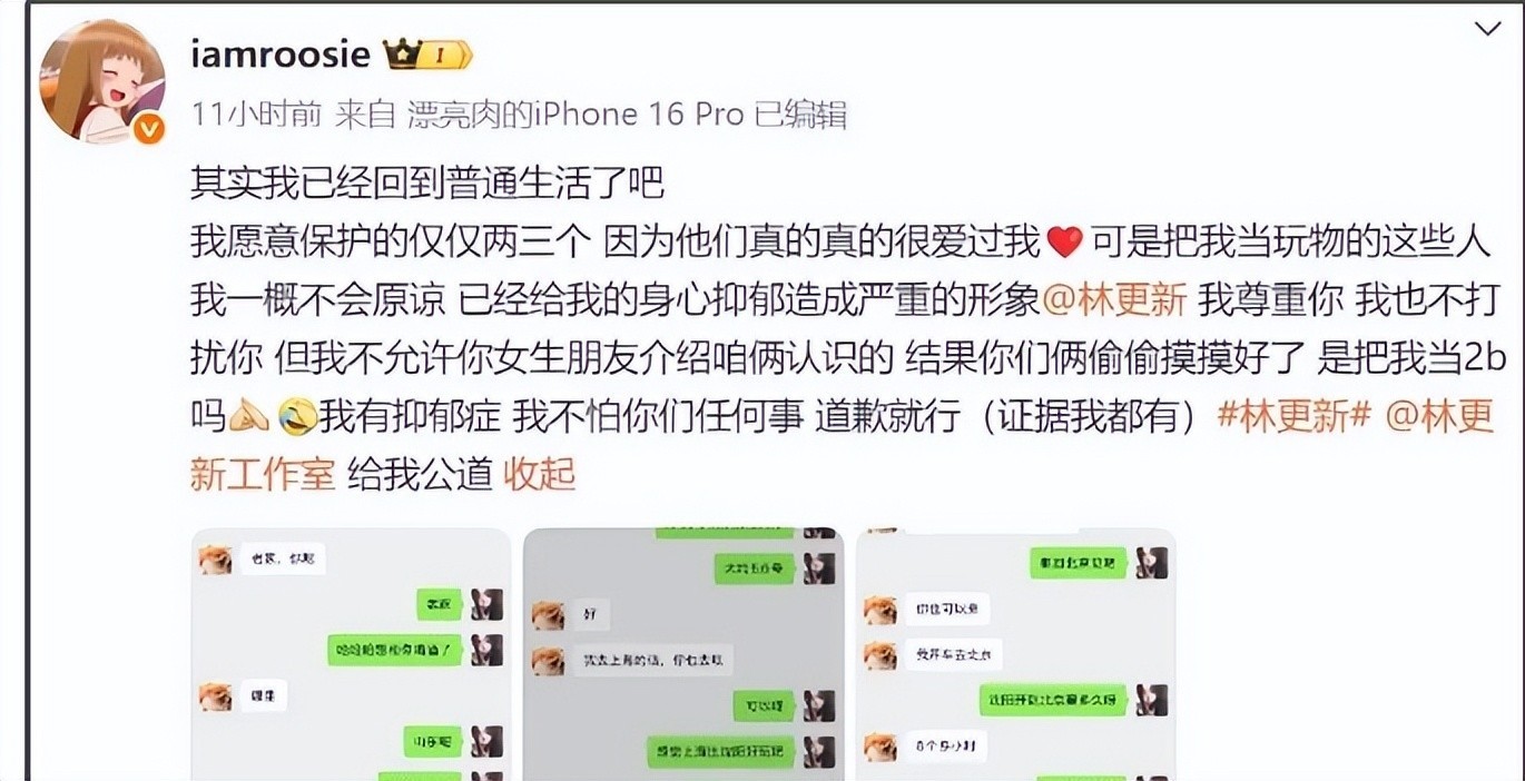 她公布的聊天记录显示,林更新曾多次主动邀约见面,提出共进晚餐、前往北京相聚等请求,语言直白且意图明显。更有甚者,她暗示尚握有涉及敏感内容的未公开材料,仅因顾及影响暂未释出。