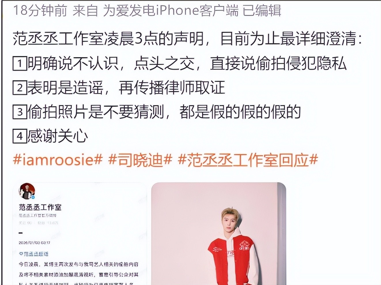 司晓迪晒出了她与范丞丞及其他人士在私人聚会中的合照,并随口提及两人是“多年玩伴级好友”。然而,范丞丞团队的应对堪称教科书级别,反应迅速且立场鲜明。